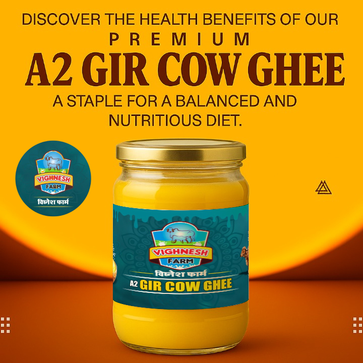 Vighnesh Farm Desi Gir Cow Bilona Ghee is made from the pure milk of indigenous Gir cows, prepared using the age-old Bilona method. In this process, fresh curd is hand-churned to extract makkhan (butter), which is then slowly simmered to make rich, golden ghee with a natural aroma and granular texture.\r\n\r\nUnlike commercial ghee, our ghee is 100% natural, chemical-free, and preservative-free, ensuring you get authentic taste and maximum nutrition in every spoon.\r\n\r\n? Key Features\r\n\r\n? Made from pure A2 Gir cow\'s milk\r\n\r\n? Traditional Bilona churning process\r\n\r\n? Golden color, rich aroma & granular texture\r\n\r\n? Free from adulteration, preservatives & chemicals\r\n\r\n? Packed hygienically to preserve freshness\r\n\r\n? Health Benefits\r\n\r\nImproves digestion and immunity\r\n\r\nStrengthens bones, joints & muscles\r\n\r\nNourishes skin, hair & overall health\r\n\r\nEnhances memory, energy & vitality\r\n\r\nIdeal for daily cooking, Ayurveda & rituals\r\n\r\n? Storage Instructions\r\n\r\nStore in a cool & dry place\r\n\r\nDo not refrigerate\r\n\r\nAlways use a clean, dry spoon\r\n\r\n? Vighnesh Farm � Pure Tradition, Pure Health.