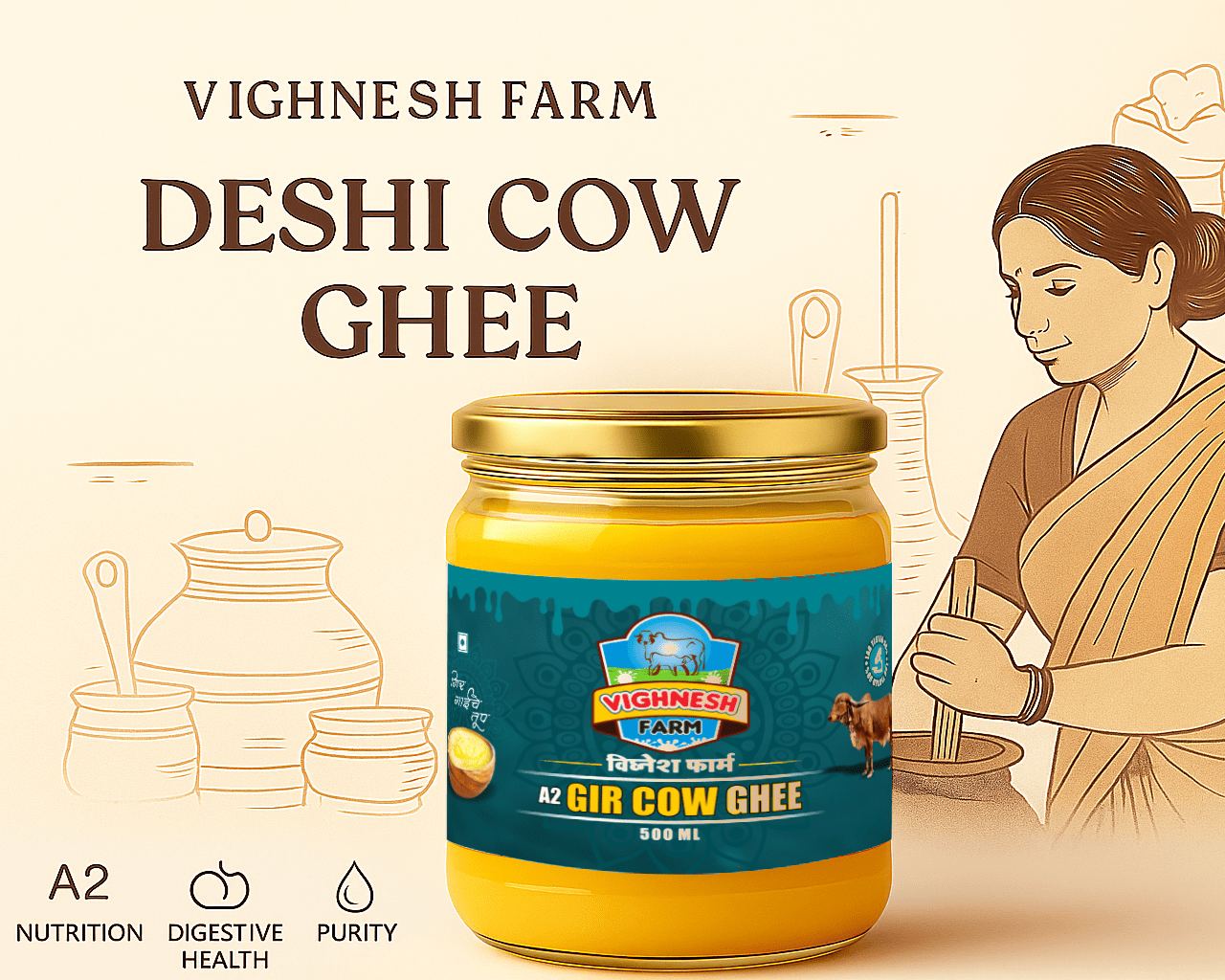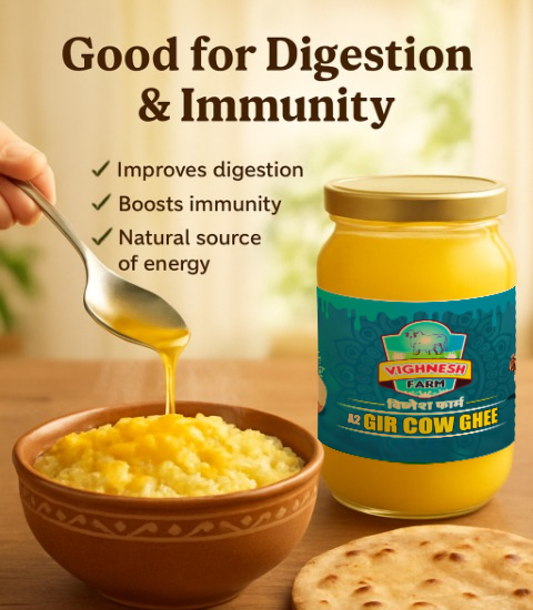 Vighnesh Farm Desi Gir Cow Bilona Ghee is made from the pure milk of indigenous Gir cows, prepared using the age-old Bilona method. In this process, fresh curd is hand-churned to extract makkhan (butter), which is then slowly simmered to make rich, golden ghee with a natural aroma and granular texture.\r\n\r\nUnlike commercial ghee, our ghee is 100% natural, chemical-free, and preservative-free, ensuring you get authentic taste and maximum nutrition in every spoon.\r\n\r\n? Key Features\r\n\r\n? Made from pure A2 Gir cow\'s milk\r\n\r\n? Traditional Bilona churning process\r\n\r\n? Golden color, rich aroma & granular texture\r\n\r\n? Free from adulteration, preservatives & chemicals\r\n\r\n? Packed hygienically to preserve freshness\r\n\r\n? Health Benefits\r\n\r\nImproves digestion and immunity\r\n\r\nStrengthens bones, joints & muscles\r\n\r\nNourishes skin, hair & overall health\r\n\r\nEnhances memory, energy & vitality\r\n\r\nIdeal for daily cooking, Ayurveda & rituals\r\n\r\n? Storage Instructions\r\n\r\nStore in a cool & dry place\r\n\r\nDo not refrigerate\r\n\r\nAlways use a clean, dry spoon\r\n\r\n? Vighnesh Farm � Pure Tradition, Pure Health.